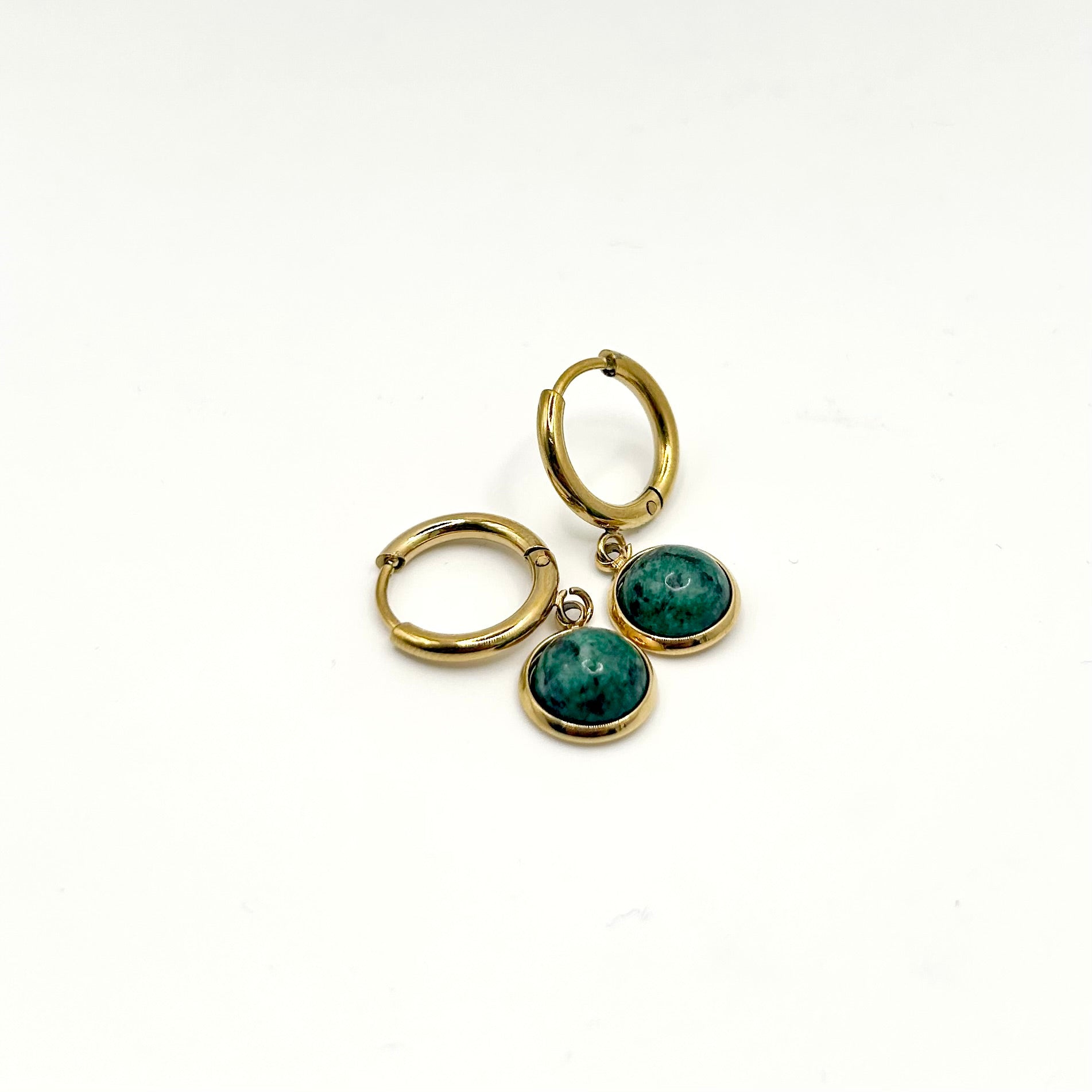 Estos aretes combinan la elegancia del acero inoxidable con baño en oro de 18k y la belleza natural de la turquesa africana, creando una pieza moderna con un toque bohemio y sofisticado.